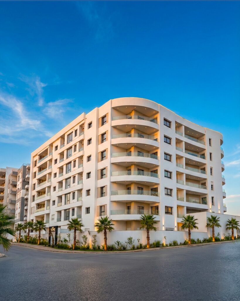 Située dans le quartier structuré d’Ennasr II, la Résidence Pivoine s’affirme par une architecture contemporaine à la fois sobre et rigoureuse. Ce complexe résidentiel en R+6, développant 11000 m², a été conçu pour offrir une réponse précise aux défis de l’habitat collectif dense.